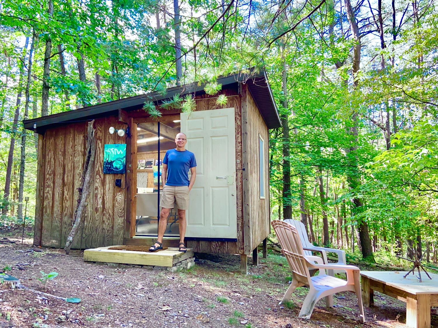 I create from a studio at my cabin sanctuary in West Virginia. Here, the landscape is my teacher. Trees falling across my hiking trail remind me that it’s easier to navigate around obstacles than to move them. Water teaches fluidity, while straight lines are rare in a world of random imperfection. These lessons infuse my art with playful exploration and a co-creative relationship with materials.